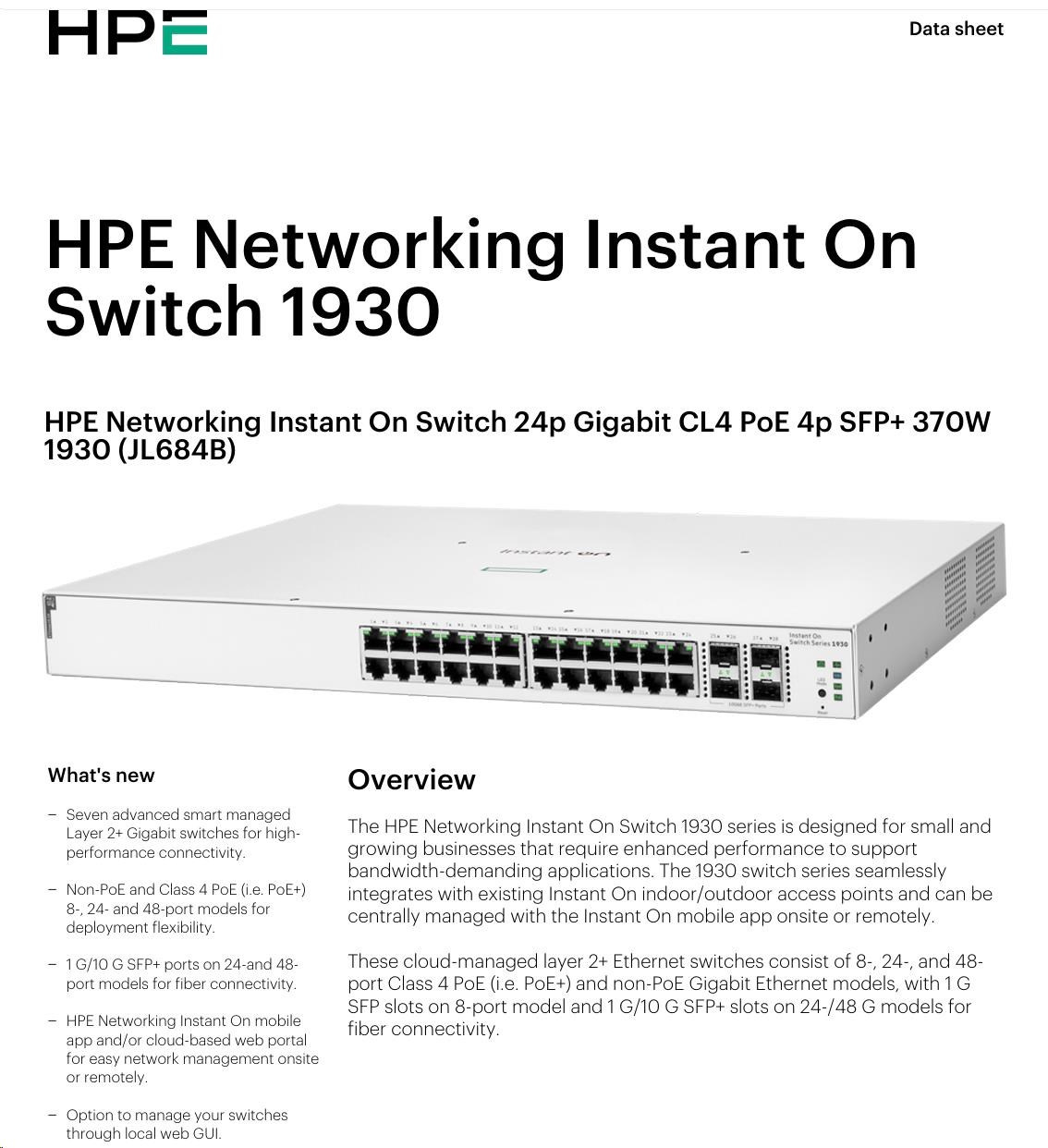 HPE Networking Instant On Switch 24p Gigabit CL4 PoE 4p SFP+ 370W 1930 (JL684B)