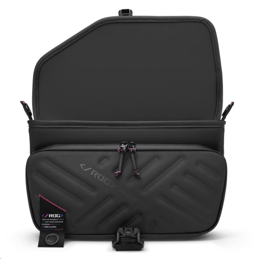 Brašny ROG SLASH jsou sice nenápadné, ale pro ty, kteří si jich všimnou, představují odvážné prohlášení. Modré a růžové akcenty a prošívání zdobí tašku, dodávají jí barevný nádech a zajišťují, aby svět věděl, že nosíte něco opravdu výjimečného. Vzhled ROG SLASH je také vybaven jedinečným monogramem ROG.