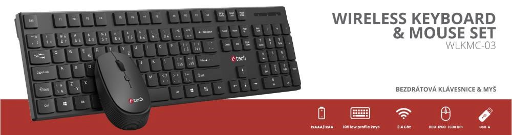 Bezdrátový set klávesnice a myši C-TECH WLKMC-03 přináší pohodlí a svobodu pohybu bez rušivých kabelů. Díky spolehlivé 2,4GHz bezdrátové technologii získáte stabilní a rychlé připojení s dosahem až 10 metrů, což zajišťuje plynulou práci bez výpadků. Stačí připojit kompaktní USB-A přijímač do portu vašeho počítače a můžete ihned začít pracovat – není potřeba žádná složitá instalace díky technologii Plug & Play.