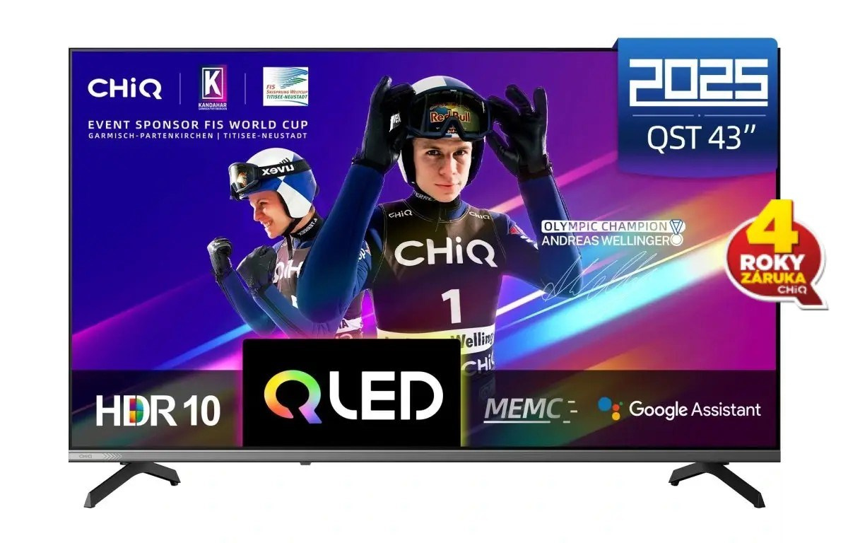 CHiQ 43“ U43QST, ultratenká metalická bezrámečková QLED Smart Google TV 5.0 s několika herními funkcemi, HDR10, HLG, obrazovkou s Ultra HD s rozlišením 3840 x 2160 pixelů, prostorovým zvukem Dolby Audio a dbx-tv.