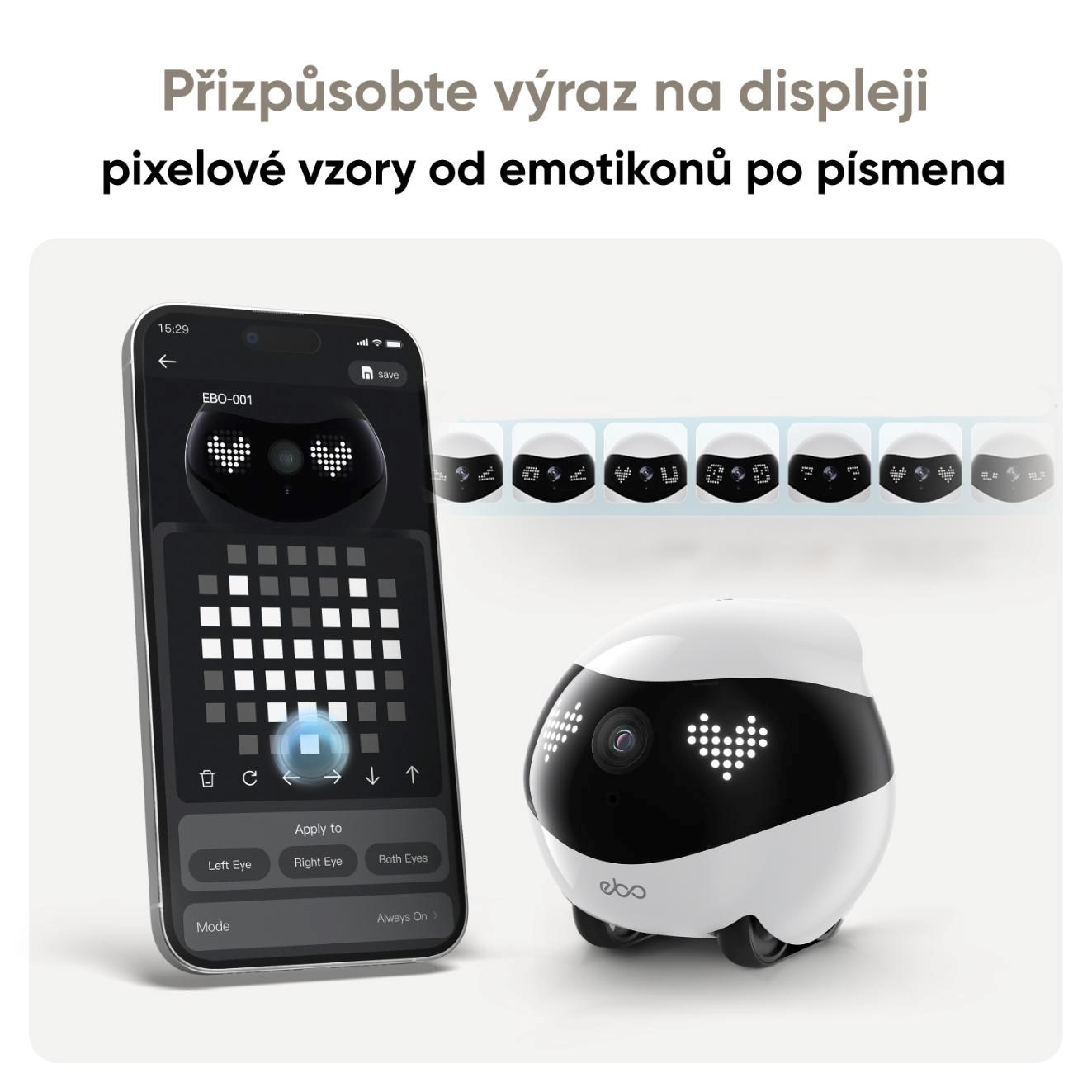 EBO Air 2 má dvojici pixelových displejů, které simulují oči a dávají mu přátelský, hravý charakter. Tyto animované oči mohou měnit výrazy podle situace – při nabíjení, pohybu nebo komunikaci. Uživatel si může přizpůsobit vzhled očí podle nálady či prostředí. Tento detail z něj dělá nejen chytrou kameru, ale i sympatického společníka pro celou rodinu.