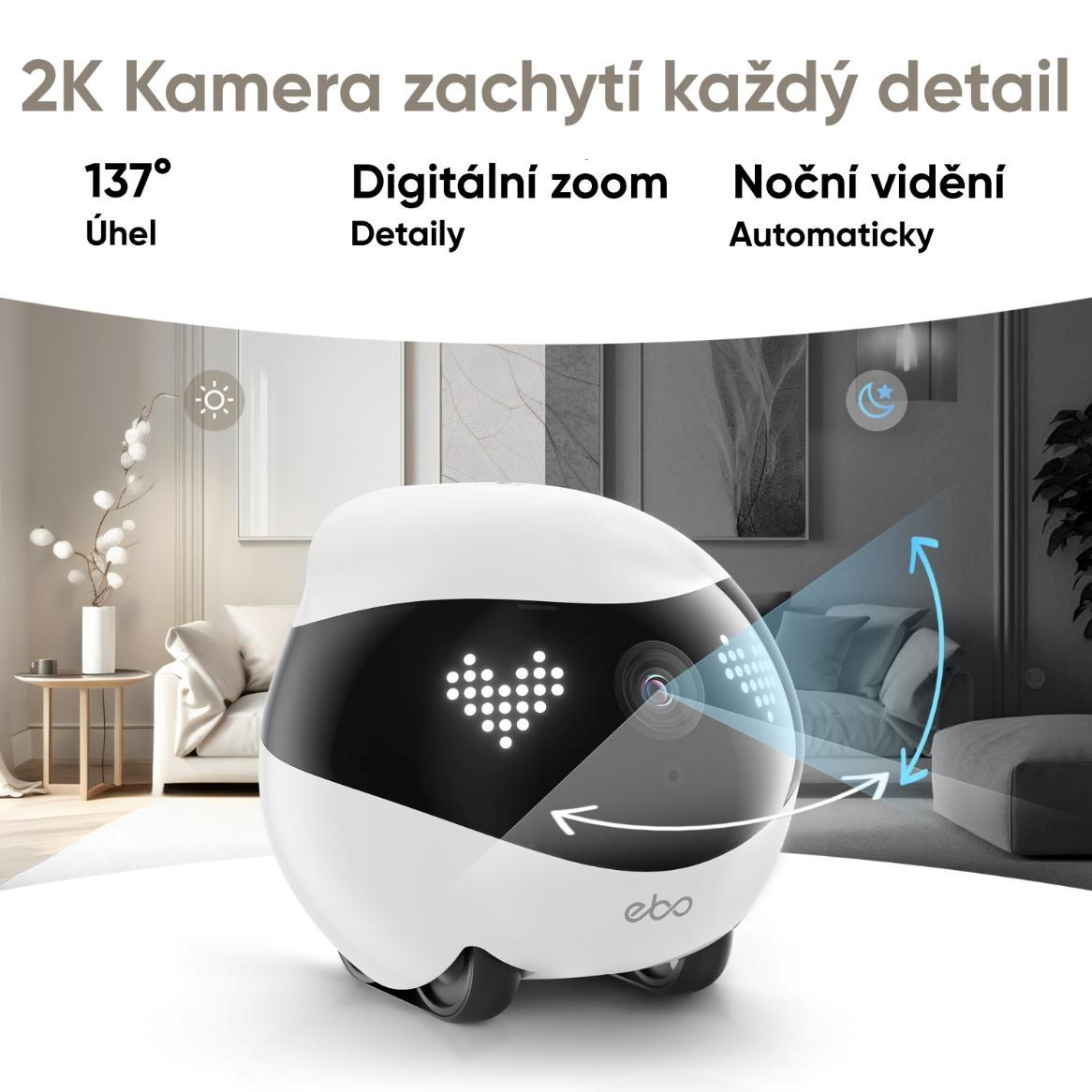 Vestavěná 2K kamera (2304 × 1296) přináší ostrý obraz a vysoký kontrast, ideální pro každodenní dohled nad rodinou či domácností. Širokoúhlý objektiv zachytí více prostoru a zajistí, že vám nic neunikne ani v rozlehlejších místnostech. Obraz z kamery je plynulý, realistický a vhodný i pro noční sledování díky kvalitnímu senzoru. Vše lze sledovat živě nebo ukládat pro pozdější přehrání přímo v mobilní aplikaci.