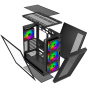 Tato PC skříň je sídlem nejen pro váš hardware, ale i pro čtveřici ventilátorů Infinity Mirror. Ty jsou strategicky rozmístěny a perfektně vyzbrojeny pro boj proti přehřívání počítače, ovšem jak je u EVOLVEO Scorpio-BK-4 dobrým zvykem, dbají i na eleganci. Zdobí je Multi ARGB podsvícení s 22 LED diodami (8 uprostřed a 14 na vnějším obvodu každého ventilátoru), doplněné o působivý zrcadlový design. Díky soustavě zrcadel se světlo odráží a znásobuje, až se vám zdá, že v PC skříni svítí stovky žároviček. Jde o opravdu úchvatný efekt, který dává herní atmosféře tu pravou šťávu. Styl podsvícení ventilátorů můžete nechat na vaší základní desce nebo ho mít díky tlačítku v pravé horní části skříně ve vlastní režii. K dispozici máte 14 barevných režimů, od jednobarevného osvětlení přes decentní prolínání barev až po futuristické blikací módy.