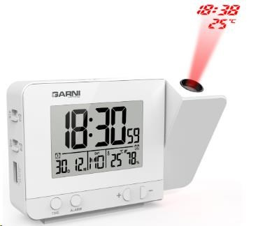 Digitální budík s projekcí času a vnitřní teploty s LCD displejem, časem řízeným rádiovým signálem DCF-77 a měřením vnitřní teploty a relativní vlhkosti LCD displej o rozměrech 63 x 42 mm s možností stálého osvětlení při napájení síťovým adaptérem, nebo krátkodobým osvětlením na 8 s při napájení bateriemi 3 stupně jasu osvětlení displeje, možnost vypnutí osvětlení displeje (při napájení síťovým adaptérem) velikost číslic na displeji – čas 25 mm, datum, zkratka názvu dne, vnitřní teplota a rel. vlhkost 8,5 mm čas a datum řízené signálem DCF-77 s možností manuálního nastavení ikona příjmu signálu DCF-77 zkratka názvu dne 12ti, nebo 24 hodinový formát zobrazení času možnost nastavení časového pásma od -12 do +12 hodin budík s 2 budícími časy s funkcí opakovaného buzení (Snooze) po 5 minutách budící signál - 10 sekund 1 pípnutí za sekundu, 10 sekund 2 pípnutí za sekundu, 10 sekund 4 pípnutí za sekundu a poté stálé pípání projekce času a vnitřní teploty s možností otočení obrazu o 180°, možnost sklopení tubusu projektoru o 90° dopředu a dozadu barva projekce červená stálá projekce při napájení síťovým adaptérem s možností vypnutí zobrazení hodnot vnitřní teploty a relativní vlhkosti zobrazení teploty ve °C, nebo °F USB port pro nabíjení mobilních zařízení (pouze při napájení hlavní jednotky síťovým adaptérem), maximální nabíjecí proud 1 000 mA napájení síťovým adaptérem, nebo bateriemi možnost postavení barva černá Obsah balení: 1 x digitální budík GARNI 140 1 x síťový adaptér český, slovenský, německý, anglický, italský, polský a maďarský návod.