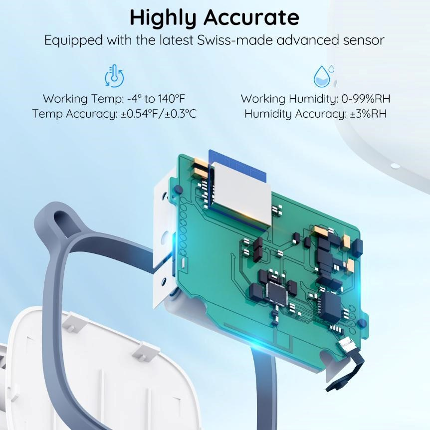 Vysoce přesný senzor zajišťuje spolehlivé a konzistentní měření teploty i vlhkosti v reálném čase, takže máte vždy k dispozici skutečně přesná data. Díky pokročilé senzorové technologii Govee jsou i malé změny prostředí okamžitě zaznamenány, což je ideální pro citlivé prostory jako terária, inkubátory, vinné sklepy nebo ložnice. Přesná data jsou základem pro správná rozhodnutí, vyšší komfort a zdravější prostředí každý den. Senzor pracuje v rozmezí -20 až 60 °C, vlhkosti 0-99 % a přesný je na 0,3 °C a 3% RH.