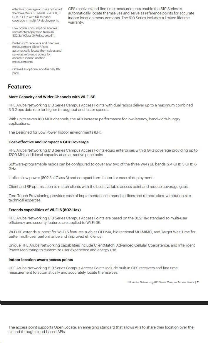 Wi-Fi Optimization Client Optimization Aruba's patented AI-powered technology eliminates sticky client issues by steering a client to the AP where it receives the best radio signal. ClientMatch steers traffic from the noisy 2.4 GHz band to the preferred 5 GHz or 6 GHz band depending on client capabilities and AP setttings. ClientMatch also dynamically steers traffic to load balance APs to improve the user experience. Automated Wi-Fi Radio Frequency Management To optimize the user experience and provide greater stability, Aruba AirMatch allows organizations to automate network optimization using machine learning. AirMatch provides dynamic bandwidth adjustments to support changing device density, enhanced roaming using an even distribution of Effective Isotropic Radiated Power (EIRP) to radios, and real-time channel assignments to mitigate co-channel interference. AirMatch also ensures that the two radios of Aruba 610 Series Access Points are automatically configured in the most effective and efficient way to deliver full tri-band coverage. Application Assurance With Aruba Air Slice, organizations can provide application assurance to their users that goes beyond the traditional capabilities of airtime fairness. After the SLAs are configured, Air Slice monitors network usage, automatically allocates radio resources, and dynamically adjusts radio resources as new users connect and applications sessions begin or end. Aruba Advanced Cellular Coexistence (ACC) Unique to Aruba, Advanced Cellular Coexistence uses built-in filtering to automatically minimize the impact of interference from cellular networks, distributed antenna systems (DAS), and commercial small cell or femtocell equipment. Intelligent Power Monitoring (IPM) For better insights into energy consumption, Aruba APs continuously monitor and report hardware energy usage. Unlike other vendor's access points, Aruba APs can also be configured to enable or disable capabilities based on available PoE power - ideal when wired switches have exhausted their power budget. Enterprises can deploy Wi-Fi 6E APs and update switching and power at a later if needed based on their actual usage. Self-Locating APs Indoor location shouldn't require guesswork or costly overlay technologies. Aruba's Wi-Fi 6 and 6E APs help organizations leverage their wireless investment to deliver indoor location - everywhere. Aruba 610 Series Campus APs include built-in GPS receivers and intelligent software to allow them to automatically locate themselves accurately within the universal framework of latitude and longitude. As part of Aruba's indoor location services solution, they serve as reference points for client devices using fine time measurements (802.11mc) and other location technologies. In addition, Aruba's Wi-Fi 6 and 6E APs support Open Locate, an emerging standard that allows APs to share their location over the air and through cloud-based APIs, enabling mobile devices to locate themselves and applications to support network analytics. APs as an IoT transport platform The Aruba 610 Series includes an integrated Bluetooth 5 and 802.15.4 radio for Zigbee support to simplify deploying and managing IoT-based location services, asset tracking services, security solutions, and IoT sensors. There is also a USB-port extension to provide IoT connectivity to a wider range of devices. These IoT capabilities allows organizations to leverage Aruba APs as an IoT transport platform, which eliminates the need for an overlay infrastructure and additional IT resources and can accelerate IoT initiatives. In addition, Target Wake Time (TWT), part of the 802.11ax standard, establishes a schedule for when clients need to communicate with an AP. This helps improve client power savings and reduces airtime contention with other clients, which is ideal for IoT. Aruba secure infrastructure The Aruba 610 Series includes build-security capabilities such as: