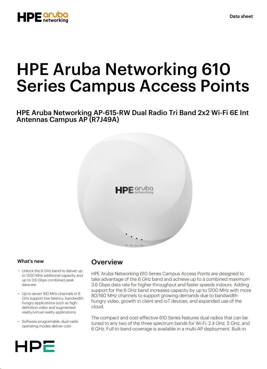 | Aruba AP-615 (RW) Dual-radio Tri-band 2x2:2 802.11ax Wi-Fi 6E Internal Antennas Campus AP | R7J49A |