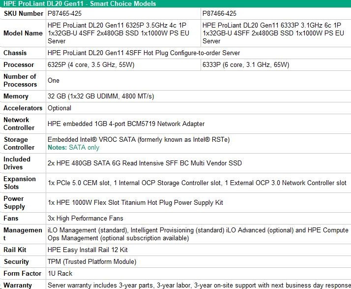 HPE PL DL20g11 6325P (3.5G/4C8T) 1x32G 2x480G SSD VROC 4SFF-HP 4p1Gb 1x1000W Smart Choice.