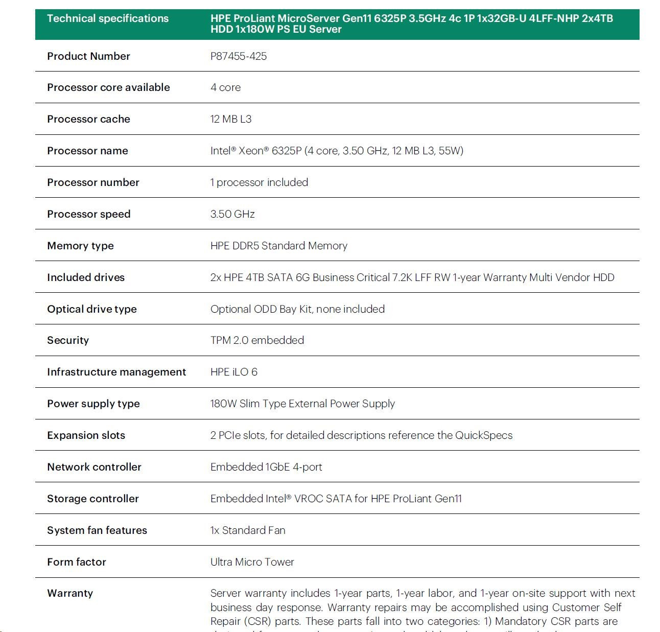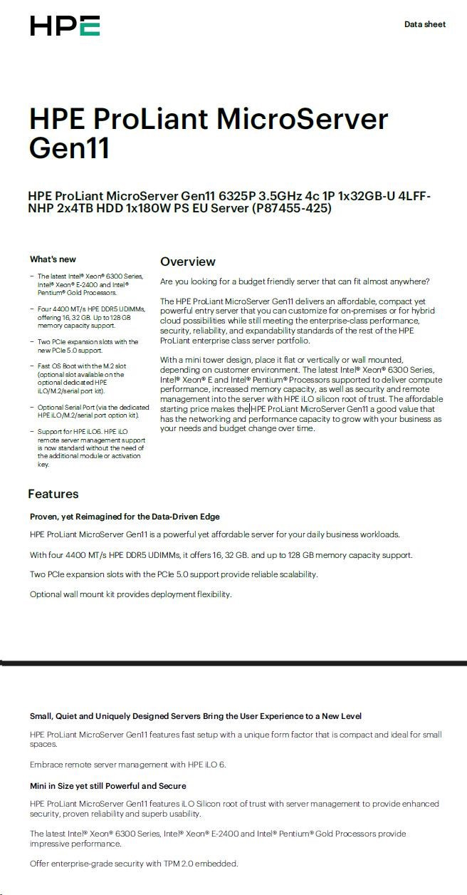 HPE PL MicroServer Gen11 6325P (3.5/4C) 1x32G 2x4TB SATA 4LFF/SFF-NHP VROC 4p1G iLoPort (P65741) NBD111 Smart Choice.
