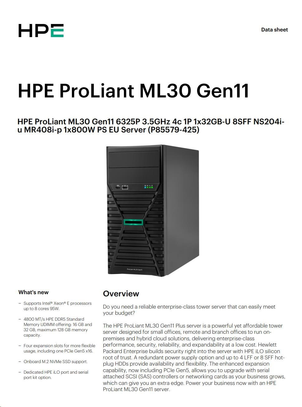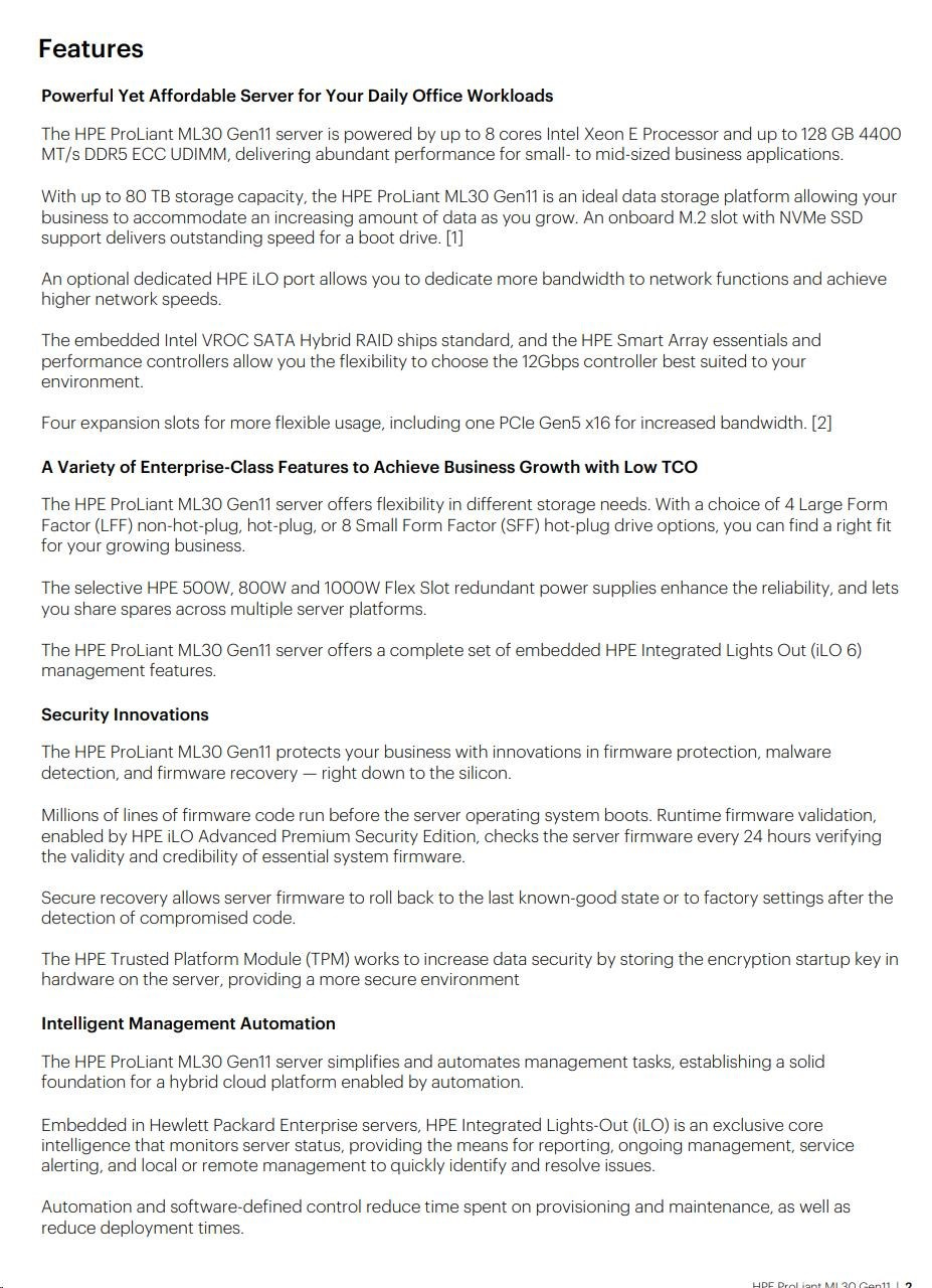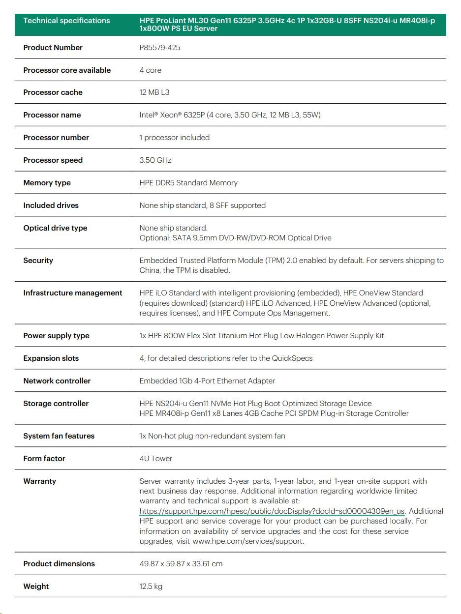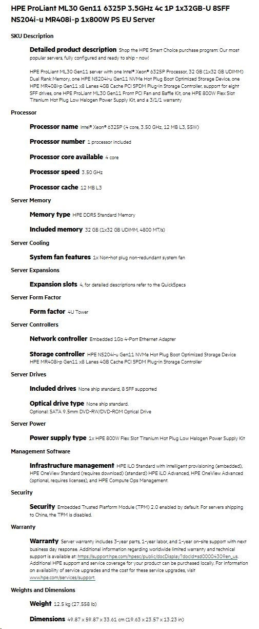 HPE PL ML30 gen11 6325P (3.5G/4C8T) 1x32G 8SFF NS204i-u(2x480g) MR408i-p 2x800W 3/1/1 Smart Choice.
