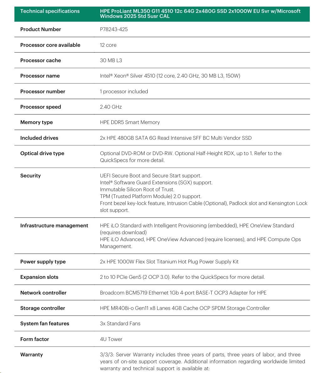 Model Name HPE PL ML350g11 4510 (2.4G/12C) 2x32G 2x960G 2x1000W MR408i-o 8-24SFFU3