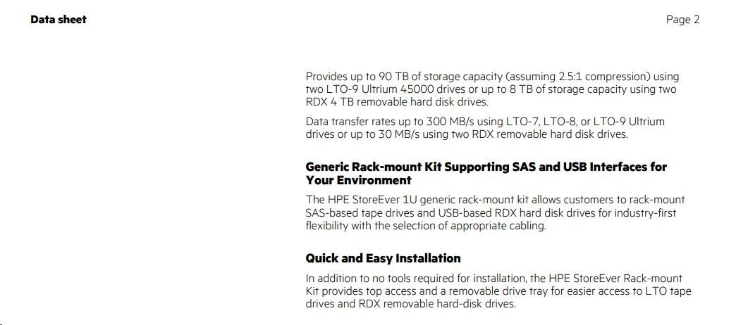 HPE StoreEver Rack-mount Kit is ideal for customers who have limited space in their rack as it allows for a smaller footprint leaving valuable space for other key components in the data center. The 1U HPE StoreEver Rack-mount Kit allows users to mix a variety of technologies, including LTO Ultrium, as well as RDX removable disk technology by selecting the appropriate cabling. The enclosures support standard internal LTO tape drives and HPE RDX Removable Disk Backup System, allowing for drive upgrades when you need additional capacity or want to migrate to a new generation of LTO tape drives or RDX removable disk technology.Data sheet Page 2 Provides up to 90 TB of storage capacity (assuming 2.5:1 compression) using two LTO-9 Ultrium 45000 drives or up to 8 TB of storage capacity using two RDX 4 TB removable hard disk drives. Data transfer rates up to 300 MB/s using LTO-7, LTO-8, or LTO-9 Ultrium drives or up to 30 MB/s using two RDX removable hard disk drives.