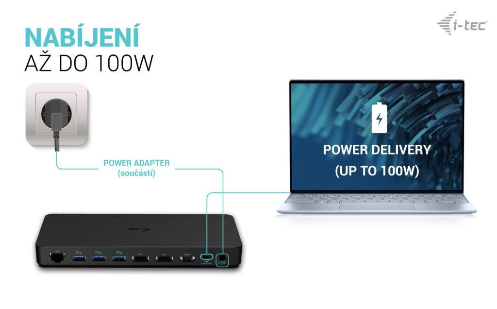 • Dokovací stanice podporuje až 100W napájení připojeného notebooku nebo tabletu.