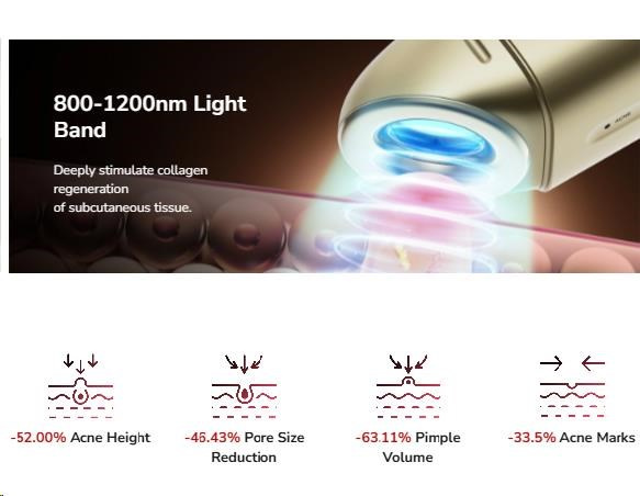 - Pásmo 800-1200nm: Proniká hlouběji do pokožky, kde působí na mazové žlázy. Inhibuje jejich nadměrnou aktivitu, vyrovnává produkci mazu a zabraňuje ucpávání pórů. Zároveň stimuluje regeneraci kolagenu, což urychluje hojení a zesvětlování stop po akné.