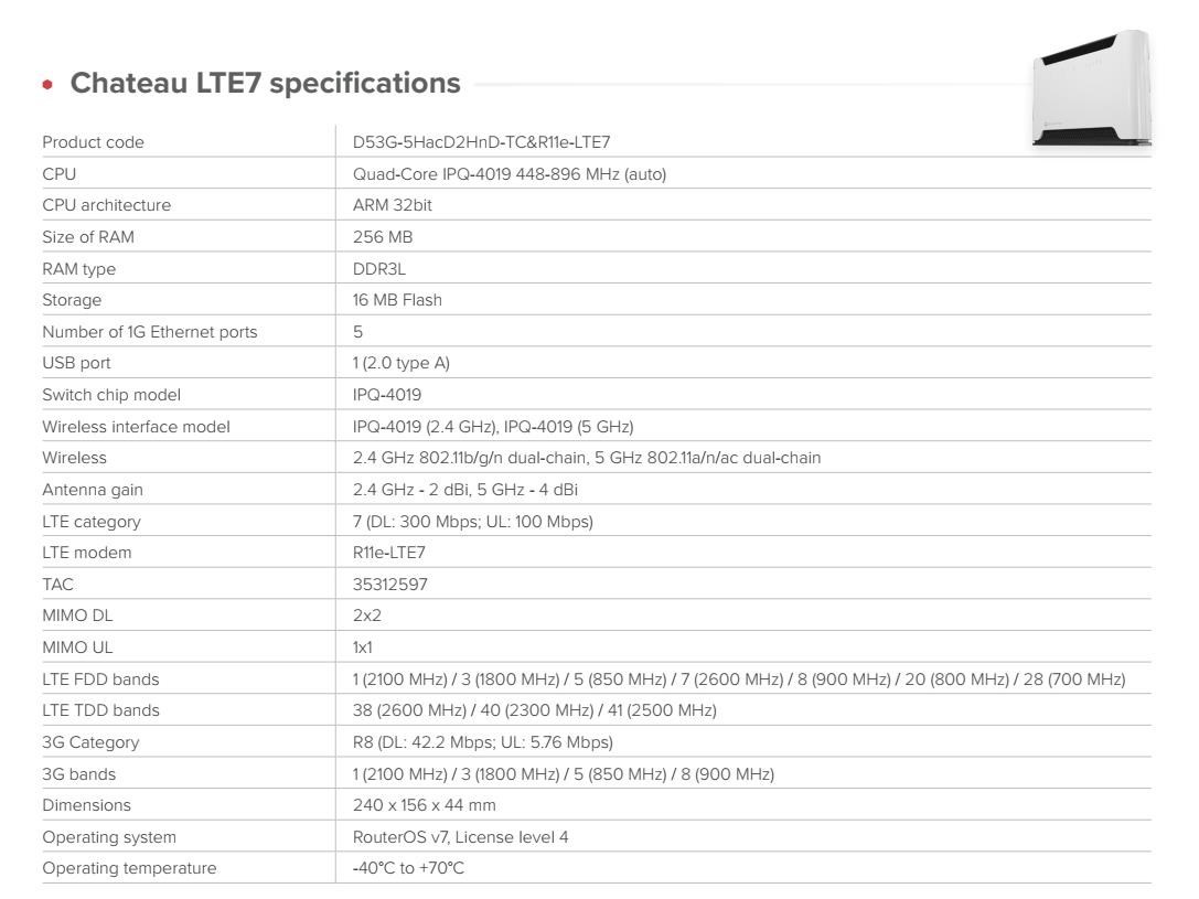 Univerzální domácí router s novým modemem CAT7 a rychlým čtyřjádrovým procesorem pro všechny úkoly související s bezpečností a správou domácí sítě. Dvoupásmové Wi-Fi s duálním řetězcem, 5 gigabitových portů a plná výbava operačního systému RouterOS v7 Ideální pro bezpečné připojení VPN, domácí kanceláře nebo sítě malých podniků, které kladou důraz na funkčnost i estetiku. Skvělý prvek jak v rukou zkušených správců systémů, tak v domácnosti pro uživatele bez jakýchkoli IT znalostí. Proč upgradovat na CAT7? • Dvojnásobná rychlost uploadu • Rozšířená podpora frekvencí – nyní zahrnuje pásmo 32 (1500 MHz) pro ještě lepší výkon v přetížených oblastech. • Stejný osvědčený design – žádné změny v instalaci nebo konfiguraci. • Nižší náklady – lepší konektivita, která ve skutečnosti stojí méně. Všechna nová zařízení CAT7 také podporují 2×2 MIMO DL a agregaci pásem. To znamená, že mohou současně využívat více pásem LTE. To je obrovská výhoda, když je v dané oblasti mnoho mobilních uživatelů. Nabízí lepší odezvu v přeplněném prostředí, vyšší účinnost v situacích se slabším signálem. Po zapnutí agregace pásem jsme zaznamenali zdvojnásobení rychlosti internetu ve venkovských oblastech. Chateau LTE7 je vysokorychlostní dvoupásmový domácí přístupový bod, který se přizpůsobí vašim potřebám Chateau je navržen tak, aby sloužil nejrůznějším skupinám uživatelů: od profesionálů v oblasti IT, kteří jej mohou využít až na hranici svých možností, po běžné domácnosti. K připojení všech domácích zařízení (mediálních serverů) je připraven 5x gigabitový ethernetový port (PC věže, televizory). Můžete si také ponechat LTE jako zálohu a použít gigabitový Ethernet k připojení k poskytovateli internetu pro ještě vyšší rychlosti. Konec úzkých hrdel v podobě nízkokapacitních domácích routerů Mnoho domácností je omezeno levnými routery bez LTE funkcí, které jednoduše nezvládají nároky moderního využívání internetu. Řešením je Chateau. Svobodně kdekoliv s LTE Dosáhněte konzistentní rychlosti až 300 Mb/s díky agregaci nosných sítí, protože CAT6 umožňuje zařízením využívat více pásem současně. Chateau LTE6 poskytuje lepší odezvu v přeplněném prostředí a vyšší účinnost v situacích se slabším signálem mimo městské aglomerace. Vlastnosti Chateau je vybaven všemi pokročilými funkcemi RouterOS, takže získáte řešení podnikové úrovně za cenu spotřebitelské třídy. • využívejte zabezpečenou síť VPN z kanceláře přímo k vám domů • povolte nejrůznější druhy rodičovské kontroly • ponořte se do specifických pravidel brány firewall a hardwarové akcelerace IPsec • nakonfigurujte sítě VLAN, nastavte e-mailová nebo SMS upozornění • můžete automatizovat složitá spouštěcí oznámení (např: "VAROVÁNÍ!" pokud šířka pásma dosáhla hodnoty X po dobu trvání Y!) Podpora nasazení mobilními operátory Chateau podporuje technologii TR-069, která umožňuje vytvářet vlastní možnosti vzdálené správy klientů. Nejjednodušší a nejzákladnější nastavení routeru můžete mít na stejné webové stránce, kterou používáte k placení mobilního účtu. Technické specifikace: Product code: D53G-5HacD2HnD-TC&R11e-LTE7 CPU: Quad-Core IPQ-4019 448-896 MHz (auto) CPU: architecture ARM 32bit Size of RAM: 256 MB RAM type: DDR3L Storage: 16 MB Flash Number of 1G Ethernet ports: 5 USB port: 1 (2.0 type A) Switch chip model: IPQ-4019 Wireless interface model: IPQ-4019 (2.4 GHz), IPQ-4019 (5 GHz) Wireless: 2.4 GHz 802.11b/g/n dual-chain, 5 GHz 802.11a/n/ac dual-chain Antenna gain: 2.4 GHz - 2 dBi, 5 GHz - 4 dBi LTE category: 7 (DL: 300 Mbps; UL: 100 Mbps) LTE modem: R11e-LTE7 TAC: 35312597 MIMO DL: 2x2 MIMO UL: 1x1 LTE FDD bands: 1 (2100 MHz) / 3 (1800 MHz) / 5 (850 MHz) / 7 (2600 MHz) / 8 (900 MHz) / 20 (800 MHz) / 28 (700 MHz) LTE TDD bands: 38 (2600 MHz) / 40 (2300 MHz) / 41 (2500 MHz) 3G Category: R8 (DL: 42.2 Mbps; UL: 5.76 Mbps) 3G bands: 1 (2100 MHz) / 3 (1800 MHz) / 5 (850 MHz) / 8 (900 MHz) Dimensions: 240 x 156 x 44 mm Operating system: RouterOS v7, License level 4 Operating temperature: -40°C to +70°C Napájení: Number of DC inputs: 1 DC jack input Voltage: 12-28 V Power adapter nominal voltage: 24 V Power adapter nominal current: 1.2 A Max power consumption without attachments: 16 W Max power consumption: 21 W Upozornění Výrobce Mikrotik neposkytuje záruku na zařízení poškozená přepětím. Zařízení je třeba adekvátně chránit proti indukovanému elektrostatickému přepětí či přepěťovým špičkám na silovém vedení. Pro venkovní instalace používat výhradně stíněnou kabeláž (FTP/SFTP), jednotky korektně uzemnit (užití integrovaného zemnícího členu, ethernetové přepěťové ochrany). Zařízení vždy provozujte s poslední výrobcem publikovanou verzí (výrobcem označenou "Stable") operačního systému RouterOS. Taková verze garantuje nejoptimálnější funčknost, obsahuje opravené chyby z verzí předchozích a výkonová vylepšení..