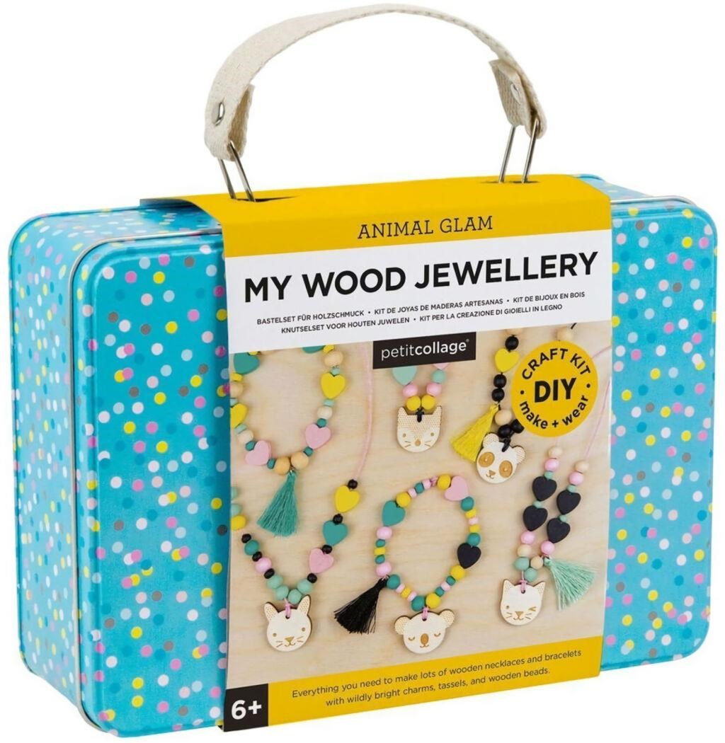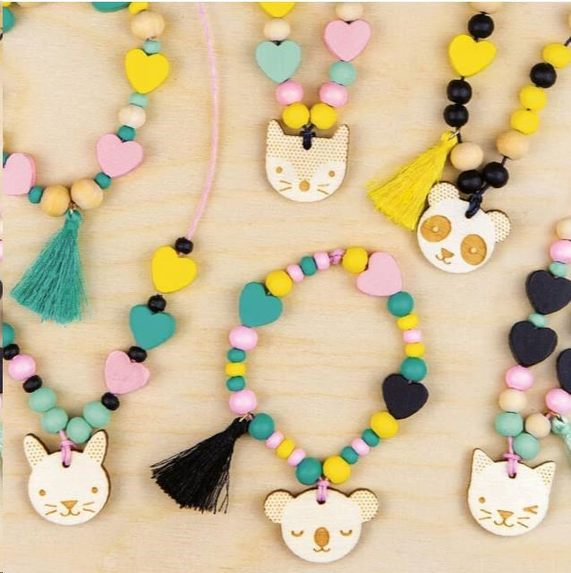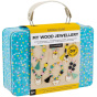 Souprava pro výrobů šperků dle vlastní fantazie obsahuje velké množství dřevěných korálků, odzdob a přívěsků, také ale šňůrky a bezpečnou navlékací jehlu. Sada je spolu s návodem k použití balena v praktickém plechovém kufříku vybaveném uchem.