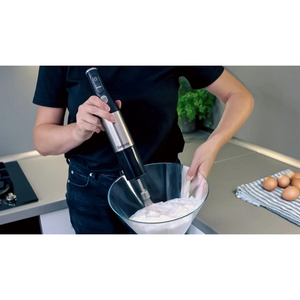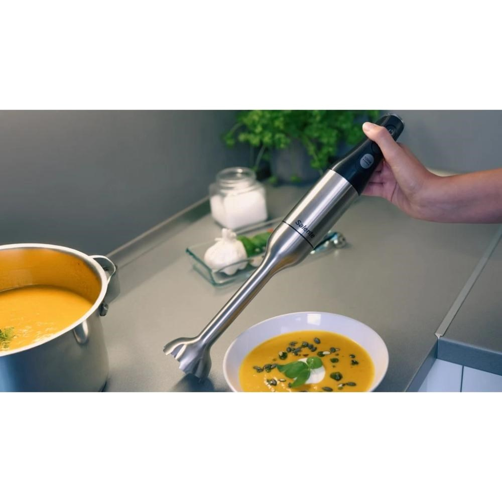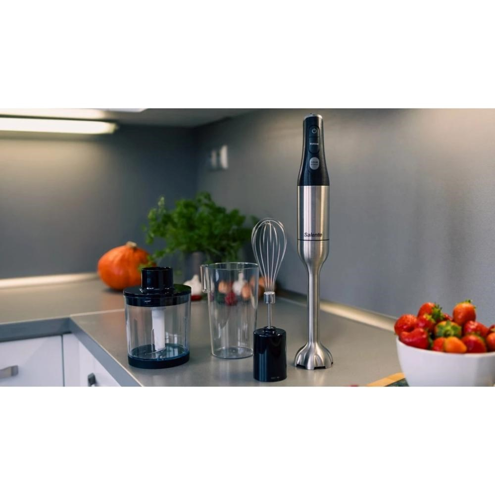 Salente Mixxo přichází do vaší kuchyně i s bohatým příslušenstvím: využívat můžete šlehací nástavec s nerezovou metličkou, mixovací nádobku o objemu 600 ml (s odměrnými ryskami po 100 ml) a taky sekáček s objemem 500 ml, který je vybaven nerezovými noži a silikonovou protiskluzovou podložkou. Pořízením tohoto všestranného mixéru zkrátka získáte kompletní vybavení, které posune vaše gastronomické kouzlení o úroveň výš.