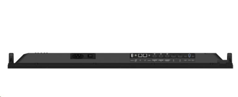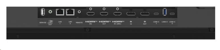 HDMI IN 1 Video Input; UHD (60 Hz) HDCP (2.2); Audio Input; ARC; CEC HDMI IN 2 Video Input; UHD (60 Hz) HDCP (2.2); Audio Input; CEC HDMI OUT Video Output; UHD (60 Hz) HDCP (2.2); Audio Output; Loop Through: HDMI IN 2, Option, Compute module DP IN 1 Video Input; UHD (60 Hz) DP 1.2; HDCP (2.2); Audio Input DP OUT Video Output; UHD (60 Hz) DP 1.2; HDCP (2.2); Audio Output; Loop Through: DisplayPort IN, USB-C 2 USB-A 1 USB (2.0 / 3.2); 4.5 W; Peripherals; USB Storage USB-A (Service) 2.5 W; Service USB-C 1 Video Input; UHD (60 Hz); DP alt. 1.2; HDCP (2.2); Audio Input; USB 2.0 / 3.2; 65 W USB-C 2 USB 2.0 / 3.2; 7.5 W; Peripherals; Storage Audio Output (3.5 mm) Audio Output; Line Out LAN 1 100 MBit/s LAN 2 Loop Through: LAN 1, RS-232C, IR; 100 MBit/s RS-232C 9600 bps Remote In (3.5 mm) Eco Sensor (IR-Extender, Ambient and Presence) Input Detect Custom; Last; First PiP / PbP 2-Split; Scalable picture size - KALIBRACE