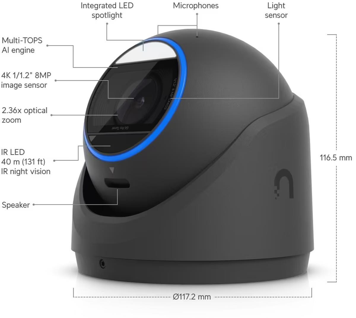 Popis produktu Ubiquiti UniFi IP turret hybrid kamera UVC-G6-Pro-Turret-W disponuje 8MP snímačem (3840 x 2160 px) při 30fps, variofokálním objektivem (5,85mm-13,8mm), kombinovaným IR/bílé světlo přísvitem pro noční vidění na vzdálenost až 40m, krytím IP66 a IK4 a vestavěnými mikrofony. Do sítě lze kameru připojit pomocí 1Gbit LAN s podporou napájení přes PoE+ s maximální spotřebou 15W. Klíčové vlastnosti • 8MP 30fps video (3840 x 2160 px) • Pokročilá AI detekce - odfiltrování falešných poplachů a spolehlivá detekce osob a vozidel • Hybridní Smart přísvit - IR/LED přísvit s dosahem 40m • Podporuje lokální záznam na microSD kartu nebo na NAS • Spravováno prostřednictvím UniFi Protect • IP66 kryt odolný proti povětrnostním vlivům • IK4 odolnost vůči vandalům • Napájení pomocí 802.3at 42.5-57V PoE+ Obsah balení • Zařízení • Šroubky, hmoždinky, nářadí • Držák na zeď/strop Technické parametry Kamera Zoom (optický):2,36x Typ objektivu:Varifokální - motorický Objektiv [mm]:5,85 až 13,8 (nastavitelný) Přísvit:Hybridní IR / bílé světlo Dosah přísvitu [m]:40 Pozorovací úhel [°]:45,5 až 113,8 Režim den/noc:Hybridní IR cut filtr / barevný Obrazový senzor ["]:1/1.2 Obraz Rozlišení:8MP Max. rozlišení [pixely]:3840 x 2160 (4K UHD) Konektory a rozhraní Slot na paměťové karty:microSD Audio:2 Mikrofony, Reproduktor Rychlost LAN:(1) 10/100/1000Mbps Napájení Napájení přes PoE:802.3at, 42 .. 57V DC Typ napájení:PoE Max. spotřeba energie [W]:15 Fyzické charakteristiky Stupeň krytí:IP66 Použití:Venkovní Antivandal (ochrana proti nárazu):IK4 Tlačítka:Reset Provozní teplota [°C]:-30 až 50 Hmotnost [g]:1200 Šířka [mm]:117 Výška [mm]:117 Hloubka [mm]:117 Barva:Bílá Obecné Kamerová řada:UniFi Protect Technologie a vymoženosti:Čtení SPZ, Face detection, Detekce vozidla, Multi-TOPS AI Engine.