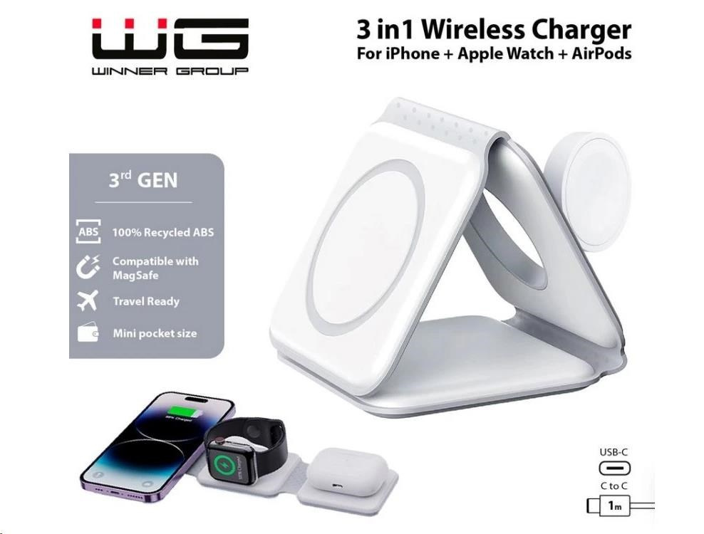 Užijte si pohodlné a stylové nabíjení s bezdrátovou nabíječkou WG 42 MaxFlex 3v1. Tento multifunkční gadget umožňuje nabíjet iPhone nebo Android telefon, Apple Watch a sluchátka současně. Díky skládacímu designu je ideální na cesty, zároveň poslouží jako elegantní stojánek na váš stůl.
